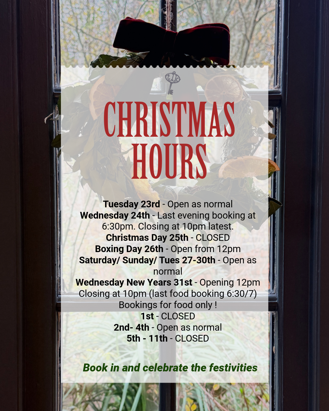 Join us this festive season! Please see the image below for our opening days and times. We look forward to celebrating with you, your friends, and family.